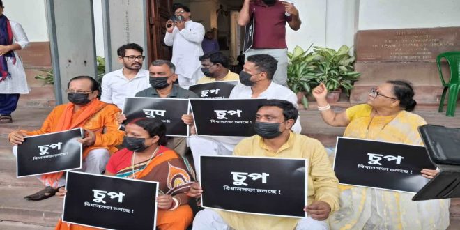 প্রসেনজিৎ ধর, কলকাতা :- বৃহস্পতিবার বিধানসভায় সেল ট্যাক্স বিলে বিরোধীরা বক্তব্য রাখার পর মন্ত্রী বক্তব্য রাখতে গেলে সব বিজেপি বিধায়ক কক্ষ ত্যাগ করেন। এই ঘটনার পর অধ্যক্ষ বিরোধী বিধায়কদের সমস্ত বক্তব্য রেকর্ড থেকে মুছে দেওয়ার সিদ্ধান্ত নেন। সেই সময় তৃণমূলের বিধায়করা জানিয়েছিলেন, এভাবে যদি নিজের বক্তব্যের পর বিরোধী সদস্যরা মন্ত্রীর বক্তব্যের সময় কক্ষ ছেড়ে চলে যান, তার অর্থ তাঁকে অপমান করা। ক্ষুব্ধ হয়ে বিজেপি পরিষদীয় দলের নেতা শঙ্কর ঘোষ-সহ একাধিক বিধায়ক কক্ষত্যাগ করেন। বিধানসভার বাইরে মুখে কালো মাস্ক পরে বসেন বিক্ষোভে। তাঁদের হাতে পোস্টার, লেখা – ‘চুপ বিধানসভা চলছে!’ যদিও বিরোধীরা বেরিয়ে গেলেও শাসকদলের সকলে ক্রীড়া বিশ্ববিদ্যালয় সংক্রান্ত বিল নিয়ে আলোচনা করেন। তবে এদিনের ঘটনায় ফের স্পষ্ট হল, বৃহস্পতিবার বিজেপি বিধায়কদের বক্তব্য কার্যবিবরণী থেকে বাদ যাওয়ার বিষয়টিকে মোটেই গুরুত্ব দেওয়া হয়নি।শুক্রবার বিধানসভায় স্পোর্টস ইউনিভার্সিটি বিল নিয়ে আলোচনায় প্রথমেই বক্তব্য রাখতে শুরু করেন বিজেপি বিধায়ক শঙ্কর ঘোষ। সে সময় শাসক দলের বিধায়করা গতকালের ঘটনার রেশ ধরে হইচই করতে শুরু করেন। এই অবস্থায় শঙ্কর ঘোষ জানান, কোনওভাবেই শাসকদলের বিধায়করা তাঁকে এভাবে ডিক্টেট করতে পারেন না। তাঁকে নির্দেশ দিতে পারেন না, বিধায়ক হিসেবে তিনি বা তাঁর দল কী করবেন। তাতে হইচই আরও বৃদ্ধি পায়।অধ্যক্ষ জানান, বিরোধীদল যে ভূমিকা পালন করেছে তারই একটা খুব শাসক দলের বিধায়কদের মধ্যে রয়েছে সেখান থেকেই এই ধরনের ক্ষোভ প্রকাশ করছেন তারা। তিনি বলেন, “আপনি নিশ্চিত করুন আজকের বক্তব্যে শেষ পর্যন্ত আপনারা থাকবেন এবং মন্ত্রীর বক্তব্য শুনবেন।” যদিও এসবের মাঝেই অধ্যক্ষ শাসক দলের বিধায়কদের শান্ত করার চেষ্টা করেন। কিন্তু কোনওভাবেই তাঁরা ক্ষান্ত হতে রাজি ছিলেন না। এই অবস্থায় বক্তব্য রাখতে থাকেন শঙ্কর ঘোষ। তিনি সরাসরি অধ্যক্ষের সিদ্ধান্ত নিয়েও প্রশ্ন তোলেন। এরপরই অধ্যক্ষ সিদ্ধান্ত নেন যে শঙ্কর ঘোষের কোনও বক্তব্যই রেকর্ডে যাবে না। পরিস্থিতি এভাবে চলতে থাকলে বক্তব্যের মাঝপথে থামিয়ে কক্ষ ত্যাগ করেন শঙ্কর ঘোষ-সহ বিরোধী দলের বিধায়করা।এরপর তাঁরা সেখান থেকে বেরিয়ে বিধানসভার সিঁড়িতে মুখে কালো মাস্ক লাগিয়ে অবস্থানে বসেন। তাদের হাতে ছিল ব্যানার যেখানে লেখা ছিল, ‘চুপ বিধানসভা চলছে’ ! যদিও এই ঘটনা নিয়ে এই মুহূর্তে তাঁরা কিছু বলেননি। বিজেপি বিধায়কদের কক্ষ ত্যাগ করার সঙ্গে সঙ্গেই আবার স্বাভাবিক হয় রাজ্য বিধানসভা।স্বাভাবিকভাবেই চলতে থাকে স্পোর্টস ইউনিভার্সিটি বিল নিয়ে এদিনের আলোচনা। কিন্তু বিরোধীদের বক্তব্য, তাঁদের শুধু কণ্ঠরোধ করা হচ্
