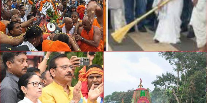 দেবরীনা মণ্ডল সাহা :-এক ঐতিহাসিক সন্ধিক্ষণের সাক্ষী থাকল দিঘা ৷ জগন্নাথ মন্দিরের উদ্বোধনের পর সৈকত নগরী দিঘায় আজ পালন হল প্রথম রথযাত্রা উৎসব। মন্দির থেকে প্রায় ১ কিমি দূরে মাসির বাড়ি দিঘার জগন্নাথের ৷ বুধবাারই দিঘায় পৌঁছেছেন মুখ্যমন্ত্রী মমতা বন্দ্যোপাধ্যায়। প্রস্তুতি থেকে নিরাপত্তা গতকালই সমস্ত কিছু খতিয়ে দেখেন তিনি ৷ দুপুর দু’টোয় রথের সামনে বিশেষ আরতির আয়োজন করা হয় ৷ সোনার ঝাঁটায় রাস্তা ঝাঁট দিয়ে রথযাত্রার সূচনা করেন মমতা ৷ জগন্নাথদেব তাঁর দুই ভাইবোন বলরাম ও সুভদ্রাকে সঙ্গে নিয়ে আলাদা আলাদা রথে পাড়ি দেয়| দিঘায় প্রথম রথ উৎসবে অপ্রীতিকর ঘটনা এড়াতে তত্পর ছিল প্রশাসন।দিঘায় রথযাত্রা উপলক্ষে বিশেষভাবে তৈরি ‘মাসির বাড়ি’তে আজ সকালে পৌঁছে জগন্নাথদেবের আরতি করেন মুখ্যমন্ত্রী মমতা বন্দ্যোপাধ্যায়। শুধু আরতিতেই নয়, রথযাত্রার মূল মিছিলেও ছিলেন মুখ্যমন্ত্রী। রথের সঙ্গে পায়ে হেঁটে এগিয়ে যেতে দেখা যায় তাঁকে। সঙ্গে ছিলেন ইসকনের একাধিক সন্ন্যাসী ও সংগঠক। রথযাত্রার প্রতি তাঁর এই সরাসরি অংশগ্রহণে মুগ্ধ সাধারণ দর্শনার্থীরা।দুপুর আড়াইটের সময়সূচি মেনেই রথের রশিতে টান পড়ে। শুরু হয় মাহাত্ম্যপূর্ণ যাত্রা। এক ঘণ্টার মধ্যেই অর্ধেক পথ পাড়ি দিয়েছে রথ। রাস্তার দু’ধারে উপচে পড়া ভিড় রীতিমতো প্রমাণ করেছে দিঘাবাসীর এবং পর্যটকদের উৎসাহ।ভিড় নিয়ন্ত্রণে রাখতে মুখ্যমন্ত্রীর আগেই নির্দেশ ছিল — রথযাত্রার সময় রাস্তায় জনসাধারণ যেন না নামেন, পদপিষ্টের আশঙ্কা এড়াতে। সেইমতো রথযাত্রার দু’ধারে ব্যারিকেড করা হয়। মানুষ ব্যারিকেডের বাইরে থেকেই রথের দর্শন করেন। আজ মাসির বাড়ি পৌঁছেছে রথ। প্রথমে বলভদ্র, সুভদ্রা ও সুদর্শনকে রথ থেকে নামিয়ে আনা হয় মাসির বাড়িতে। পরে কীর্তন সহযোগে জগন্নাথদেবকেও সেখানে নিয়ে আসা হয়।মাসির বাড়ি প্রাঙ্গণে ছিল কীর্তনের ধ্বনি, ঢাকের বাদ্যি আর শঙ্খধ্বনির আবহ। বিভিন্ন স্থান থেকে আসা ভক্তরা এই অনন্য মুহূর্তের সাক্ষী হতে পেরে আবেগাপ্লুত।