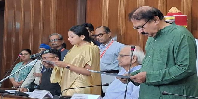দেবরীনা মণ্ডল সাহা, কলকাতা :- বিধানসভায় শপথ নিলেন কালীগঞ্জের নর্বনির্বাচিত বিধায়ক আলিফা আহমেদ। আজ, বুধবার দুপুরে এই শপথগ্রহণ অনুষ্ঠান হয়। বিধানসভার নৌসর আলি কক্ষে এদিন আলিফা আহমেদকে শপথবাক্য পাঠ করান বিধানসভার স্পিকার বিমান বন্দ্যোপাধ্যায়। শপথবাক্য পাঠের সময় উপস্থিত ছিলেন অন্যান্যরা। দিন কয়েক আগেই ঠিক হয়েছিল বুধবার শপথ নেবেন কালীগঞ্জের নবনির্বাচিত বিধায়ক আলিফা আহমেদ।বিধানসভার নৌশের আলি কক্ষে এদিন একগুচ্ছ নেতা-মন্ত্রীর উপস্থিতিতে নবনির্বাচিত বিধায়ককে শপথবাক্য পাঠ করান রাজ্য বিধানসভার অধ্যক্ষ বিমান বন্দ্যোপাধ্যায় । এদিন শপথ গ্রহণ অনুষ্ঠানে বিমান বন্দ্যোপাধ্যায় ছাড়াও উপস্থিত ছিলেন পরিষদীয় মন্ত্রী শোভনদেব চট্টোপাধ্যায়, মন্ত্রী ফিরহাদ হাকিম, চন্দ্রিমা ভট্টাচার্য, মলয় ঘটক, সুজিত বসু, মুখ্য সচেতক নির্মল ঘোষ-সহ আরও অনেকে ৷নদিয়ার তৃণমূল বিধায়ক নাসিরউদ্দিন আহমেদ মারা গিয়েছিলেন। সেই কেন্দ্রে উপনির্বাচনের দিন ঘোষণা করে নির্বাচন কমিশন। ১৯ জুন উপনির্বাচনের দিন ঠিক হয়। তৃণমূল কংগ্রেসের থেকে প্রার্থী করা হয় নাসিরউদ্দিন আহমেদের কন্যা আলিফা আহমেদকে। প্রচারের শুরু থেকেই তিনি মানুষের কাছে পৌঁছে গিয়েছিলেন। জয়ের জন্য বরাবরই আশাবাদী ছিলেন। গত ১৯ জুন কালীগঞ্জে উপনির্বাচন হয়। ২৩ জুন উপনির্বাচনের ফলপ্রকাশ হয়। গতবারের থেকেও বেশি ভোটে তিনি জয়ী হবেন। এই কথা জানিয়েছিলেন তিনি। ফলপ্রকাশের দিন শুরু থেকেই বিরোধীদের থেকে ভোটপ্রাপ্তিতে এগিয়েছিলেন তিনি। বেলা যত গড়াতে থাকে, ততই ভোটের ব্যবধান বাড়তে থাকে। ৫০ হাজারের বেশি ভোটে আলিফা আহমেদ নির্বাচনে জয়ী হন।এদিন শপথ বাক্য পাঠ করার পর বিধায়ক বলেন, “মুখ্যমন্ত্রী মমতা বন্দ্যোপাধ্যায় মতো কাজ করব । বাবার বাকি থাকা কাজ এগিয়ে নিয়ে যাওয়ার চেষ্টা করব। মুখ্যমন্ত্রী আমাকে আইডি কর্মী থেকে একজন বিধায়ক হওয়ার সুযোগ দিয়েছেন । তার জন্য কৃতজ্ঞ থাকব ।” একইভাবে নির্বাচনের সময় কৌশল নির্ধারণে সাহায্য করার জন্য অভিষেক বন্দ্যোপাধ্যায়কে কৃতজ্ঞতা জানিয়েছেন নবনির্বাচিত বিধায়ক|