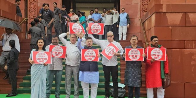 প্রসেনজিৎ ধর :-চলছে বাদল অধিবেশন। বিহারে SIR নিয়ে দফায় দফায় উত্তাল হচ্ছে সংসদ চলতি অধিবেশন। SIR বাতিলের দাবিতে লাগাতার বিক্ষোভ দেখাচ্ছেন ইন্ডিয়া শিবিরের সাংসদেরা। আজ মঙ্গলবার সংসদ চত্বরে প্ল্যাকার্ড হাতে ফের SIR-এর প্রতিবাদে বিক্ষোভ দেখান তৃণমূল সাংসদেরা।বিক্ষোভে উপস্থিত ছিলেন তৃণমূলের রাজ্যসভার নেতা ডেরেক ও’ব্রায়েন, মুখ্যসচেতক নাদিমূল হক, রাজ্যসভার সাংসদ সাকেত গোখলে, ঋতব্রত বন্দ্যোপাধ্যায় এবং লোকসভার সাংসদ বাপি হালদার ও মহুয়া মৈত্র। প্রত্যেকের হাতেই ছিল, ‘ভোট চুরি বন্ধ করো’, ‘Stop Vote Loot’ ইত্যাদি লেখা প্ল্যাকার্ড। সংসদের মকরদ্বার থেকে নির্বাচন কমিশনকে আক্রমণ করে তাঁরা স্লোগান দেন, ‘ভোট চুরি বন্ধ করো…’ ৷ সিপিআইএম (এল) সাংসদ সুদমা প্রসাদও তৃণমূল সাংসদদের এই বিক্ষোভে সামিল হন ৷ এক্স হ্যান্ডেলের একটি পোস্টে তৃণমূলের তরফে লেখা হয়- সংসদের বার্তা খুবই স্পষ্ট ৷ ভোট চুরি বন্ধ করতেই হবে ৷ ইন্ডিয়া শিবিরের অন্য সাংসদদের সঙ্গে আমাদের সাংসদরা একত্রে প্রতিবাদে সরব হলেন ৷দলের নেতা-মন্ত্রী থেকে শুরু করে সাংসদদের পাশাপাশি একেবারে শুরু থেকেই ভোটার তালিকার এই বিশেষ সংশোধনের প্রতিবাদে সরব হয়েছেন তৃণমূল সুপ্রিমো তথা বাংলার মুখ্যমন্ত্রী মমতা বন্দ্যোপাধ্যায় ৷ সোমবার বীরভূমে একটি দলীয় কর্মসূচিতে অংশ নিয়ে মমতা বলেন, “গুজরাতে বসে ভোটার লিস্ট তৈরি করছে ৷ বিজেপির এজেন্সি, ডবল ইঞ্জিন সরকারের এজেন্সিরা এসব করছে ৷ ভোটার তালিকা থেকে বাংলায় কারও নাম বাদ দিয়ে দেখুক । ছৌ-নৃত্য আছে, ঢোল আছে, শঙ্খধ্বনি আছে, দামামা বাজিয়ে দেব ৷ আমার অনুরোধ ভোটার তালিকা থেকে জেনুইন ভোটারদের নাম বাদ দেবেন না ।”