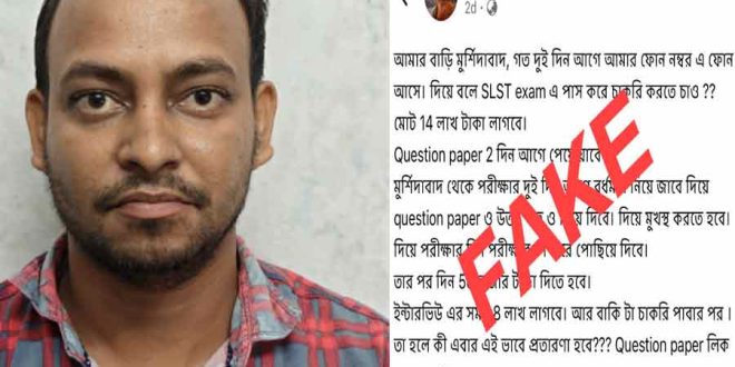 দেবরীনা মণ্ডল সাহা :-১৪ লক্ষ টাকা দিলেই এসএলএসটি পরীক্ষায় পাশ। ভুয়ো ফেসবুক পোস্ট করে গ্রেফতার যুবক | ঘটনাকে ঘিরে চাঞ্চল্য মুর্শিদাবাদে। জেলা পুলিশের নজরে একটি ফেসবুক পোস্ট পড়ে। যেখানে অনির্বাণ পাল নামের এক ব্যক্তি স্কুল সার্ভিস কমিশনের আসন্ন SLST পরীক্ষার প্রশ্নপত্র ও তার উত্তর, পরীক্ষার দুদিন আগে পাইয়ে দেওয়ার কথা বলেছে l উক্ত পোস্টটিতে ওই ব্যক্তি নিজেকে মুর্শিদাবাদের বলে দাবি করেন।দিনদুয়েক আগে অরিন্দম পাল নামে এক সোশাল মিডিয়া ব্যবহারকারী একটি পোস্ট করে। ওই পোস্টে সে দাবি করে, “আমার বাড়ি মুর্শিদাবাদ। গত দু’দিন আগে আমার ফোন নম্বরে ফোন আসে। দিয়ে বলে SLST এক্সাম পাশ করে চাকরি করতে চাও? মোট ১৪ লক্ষ টাকা লাগবে। প্রশ্নপত্র দু’দিন আগে পেয়ে যাবে। মুর্শিদাবাদ থেকে পরীক্ষার দু’দিন আগে বর্ধমান নিয়ে যাবে। পরীক্ষার প্রশ্ন পৌঁছে দেবে। তারপর দিন ৫ হাজার টাকা দিতে হবে। ইন্টারভিউয়ের সময় ৪ লাখ লাগবে। আর বাকিটা চাকরি পাওয়ার পর। তাহলে কী এবার এইভাবে প্রতারণা হবে? প্রশ্নপত্র লিক হয়ে যাবে?”এই পোস্টটি নজরে আসতেই নড়েচড়ে বসে পুলিশ। খতিয়ে দেখা হয় ওই ব্যক্তি আদতে পশ্চিম মেদিনীপুরের চন্দ্রকোনার মাংরুল গ্রাম পঞ্চায়েতের বাসিন্দা। এরপর তাকে গ্রেফতার করা হয়। কী কারণে ফেসবুকে যুবক এই ধরনের পোস্ট করেছে, তা খতিয়ে দেখছে জেলা পুলিশের আধিকারিকেরা। তবে এ বিষয়ে পশ্চিম মেদিনীপুর জেলা পুলিশ সুপার ধৃতিমান সরকার বলেন, “ধৃতকে গ্রেফতার করা হয়েছে ভুয়ো পোস্ট করার জন্য, বিরুদ্ধে আইনানুক ব্যবস্থা নেওয়া হচ্ছে।”