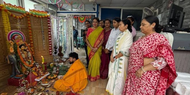 দেবরীনা মণ্ডল সাহা, কলকাতা :- বিশ্বকর্মা পুজোর দিন মুখ্যমন্ত্রী মমতা বন্দ্যোপাধ্যায়ের বাসভবনের সামনেই কালীঘাটে পুলিশ কার্যালয়ে আয়োজিত পুজোয় নিজে উপস্থিত হলেন মুখ্যমন্ত্রী। সঙ্গে ছিলেন মহিলা পুলিশকর্মীরা এবং পরিবারের সদস্যরাও। মুখ্যমন্ত্রীর ভ্রাতৃবধূ তথা অভিষেক বন্দ্যোপাধ্যায়ের মা লতা বন্দ্যোপাধ্যায়ও এই পুজোয় যোগ দেন।মমতা বন্দ্যোপাধ্যায় নিজের সোশ্যাল মিডিয়ায় কয়েকটি ছবি শেয়ার করে লিখেছেন— ‘কালীঘাটে আমার বাড়ির পাশে পুলিশের অফিসে পুলিশ আজ বিশ্বকর্মা পুজোর আয়োজন করেছে। আমি ওদের সঙ্গে ছিলাম। কয়েকটি ছবি শেয়ার করে নিলাম।’বুধবার তৃণমূল ভবনেও বিশ্বকর্মা পুজো হয়েছে। সেখানে পুজো করেন রাজ্যের মন্ত্রী শোভনদেব চট্টোপাধ্যায়। এবার বিশ্বকর্মা পুজোয় সরকারি ছুটিও ঘোষণা করেছে রাজ্য সরকার। তা আগেই জানিয়ে দেওয়া হয়েছে। পরিযায়ী শ্রমিকদের সম্মান জানিয়েই এই সিদ্ধান্ত। পুজোর সকালে সোশাল মিডিয়ায় পোস্ট করে ফের সেকথা সকলকে জানান মুখ্যমন্ত্রী মমতা বন্দ্যোপাধ্যায়। সেই সঙ্গেই জানালেন বিশ্বকর্মা পুজোর শুভেচ্ছা।এক্স হ্যান্ডেলে পোস্ট করে মুখ্যমন্ত্রী লিখেছেন, ‘সকলকে জানাই বিশ্বকর্মা পুজোর আন্তরিক শুভেচ্ছা। এবারে আমরা পরিযায়ী শ্রমিকদের সম্মান জানিয়ে বিশ্বকর্মা পুজোতে রাজ্য সরকারি ছুটি ঘোষণা করেছি।’