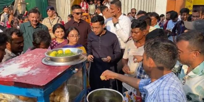 দেবরীনা মণ্ডল সাহা, কলকাতা:- অষ্টমীর দুপুরে দমদমেরএক পুজো মণ্ডপের বাইরে ভিড় জমেছে সাধারণ মানুষের। আচমকাই সেখানে হাজির তৃণমূলের সর্বভারতীয় সাধারণ সম্পাদক অভিষেক বন্দ্যোপাধ্যায়,সঙ্গে তাঁর ছোট্ট মেয়ে। নাগেরবাজারে জপুর জয়শ্রী পুজো মণ্ডপ পরিদর্শন করেন অভিষেক। এ বছর এই পুজো মণ্ডপের থিম ‘ভিনরাজ্যে হেনস্থার মুখে বাঙালি পরিযায়ী শ্রমিকরা’। এই পুজো মণ্ডপে অভিষেকের সঙ্গে দেখা যায় দমদমের বর্ষীয়ান সাংসদ সৌগত রায়কে। ছিলেন পানিহাটির বিধায়ক নির্মল ঘোষ, রাজারহাট গোপালপুর বিধানসভার বিধায়ক অদিতি মুন্সি। সেখানে উপস্থিত পরিযায়ী শ্রমিকদের সঙ্গে কথা বলেন। তাঁদের হাতে উপহার তুলে দেন। এই পুজো মণ্ডপ থেকে বেরিয়ে মেয়েকে সঙ্গে নিয়ে ফুচকা খান অভিষেক। হাতে শালপাতা নিয়ে জমিয়ে ফুচকা খেতে দেখা যায় তাঁকে। এরপর বাগুইআটি বন্ধুমহল সঙ্ঘের পুজো মণ্ডপে যান তৃণমূলের সর্বভারতীয় সাধারণ সম্পাদক।পুজো মণ্ডপ পরিদর্শনের পর সোশ্যাল মিডিয়ায় অভিষেক লেখেন, “মহাষ্টমীর শুভ মুহূর্তে আজ দমদম নাগেরবাজার জ’পুর জয়শ্রী দুর্গাপুজো মণ্ডপ এবং বাগুইআটি আশ্বিনী নগর বন্ধু মহল দুর্গাপুজোর মণ্ডপ পরিদর্শন করলাম। সমগ্র ভারতবর্ষ জুড়ে বাঙালি পরিযায়ী শ্রমিকদের ওপর যে অমানবিক অত্যাচার, নির্যাতন চলছে এবং বাংলা ভাষাভাষী মানুষের যেভাবে অপমান করা হচ্ছে, তা তুলে ধরা হয়েছে এই দুটি মণ্ডপে। পরিদর্শনের পাশাপাশি ১১ জন পরিযায়ী শ্রমিকের সঙ্গে সাক্ষাৎ করে, তাঁদের সঙ্গে দীর্ঘক্ষণ বার্তালাপ করেছি এবং পূর্ণ সহায়তার আশ্বাস দিয়েছি। শুভদিনে তাঁদের হাতে পুজোর উপহার তুলে দিলাম আজ।”