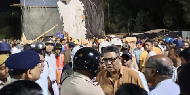 প্রসেনজিৎ ধর :-বিশ্বের সবচেয়ে বড় জগদ্ধাত্রী ছিল ট্যাগ লাইন। সপ্তমীর দিন হুড়মুড়িয়ে ভেঙে পড়ল চন্দননগর কানাইলাল পল্লীর সেই পুজো মণ্ডপ। আহত হয়েছেন পাঁচজন। হাসপাতালে তাঁদের চিকিৎসা চলছে। দর্শকদের চমকে দিতে প্রায় ৭০ ফুটের পুজো মণ্ডপ তৈরি করেছিল কানাইলাল পল্লী। মণ্ডপের সামনে ফাইবারের জগদ্ধাত্রী তৈরি করা হয়েছিল। মঙ্গলবার বিকেলে অল্প হাওয়া দিতেই ভেঙে পড়ে এই মণ্ডপ। সেই সময় বেশ কয়েকজন দর্শনার্থী ছিলেন মণ্ডপে। তাঁদের মধ্যে পাঁচজন আহত হন।স্থানীয় সূত্রে খবর, সপ্তমীতেই চন্দননগরে কানাইলালপল্লির পুজোমণ্ডপে ভিড় হয়েছিল। কারণ, এবারে তাদের চমক ছিল ৭০ ফুটের পুজোমণ্ডপ। মণ্ডপের সামনে ফাইবারের জগদ্ধাত্রী তৈরী করা হয়েছিল। খুব বেশি উচ্চতা হওয়ায় বিকেলে হাওয়ার দমকে উল্টে পড়ে পুরো মণ্ডপটি। বাঁশ চাপা পড়ে জখম হন বেশ কয়েক জন। শুরু হয় হুড়োহুড়ি। খবর পেয়ে পুলিশ আধিকারিকেরা ঘটনাস্থলে পৌঁছোন। আহত বেশ কয়েক জনকে উদ্ধার করে চন্দননগর হাসপাতালে পাঠানো হয়েছে।খবর পেয়েই দ্রুত ঘটনাস্থলে যান চন্দননগরের বিধায়ক তথা রাজ্যের মন্ত্রী ইন্দ্রনীল সেন। খোদ নিজেই হাত লাগান উদ্ধার কাজে। তাঁর নির্দেশে প্রশাসন দ্রুততার সঙ্গে উদ্ধারকার্য সম্পন্ন করে। দ্রুততার সঙ্গে উদ্ধার কাজ চালিয়ে স্বাভাবিক হয় পরিস্থিতি। স্থানীয়দের একাংশের দাবি, মণ্ডপের উচ্চতা বেশি হওয়ায় হালকা হাওয়াতেই হুড়মুড়িয়ে ভেঙে গিয়েছে।
