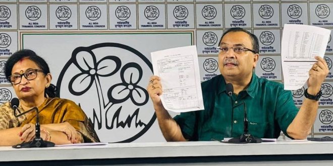 প্রসেনজিৎ ধর, কলকাতা :- ভোটার তালিকায় কারচুপির অভিযোগে নির্বাচন কমিশনের দিকে আঙুল তুলে তৃণমূল কংগ্রেস একদম সরাসরি দোষারোপ করল কমিশনকে। শাসকদলের মুখপাত্র কুণাল ঘোষ অভিযোগ করলেন, ভোটার লিস্টের হার্ড কপি ও কমিশনের আপলোড করা তালিকার মধ্যে ব্যাপক গড়মিল রয়েছে। বৃহস্পতিবার তৃণমূলের তরফে সাংবাদিক সম্মেলন করেন কুণাল ঘোষ ও মন্ত্রী চন্দ্রিমা ভট্টাচার্য। সেখানে চন্দ্রিমা বলেন মানুষের মনে আতঙ্ক তৈরি করা হচ্ছে। তারপরই বিস্ফোরক অভিযোগ তোলেন কুণাল। দাবি করেন, চুপি, চুপি বাদ দেওয়া হচ্ছে ভোটারদের নাম। ২০০২ সালের ভোটার তালিকার হার্ড কপিতে যাঁদের নাম ছিল, সম্প্রতি কমিশনের আপলোড করা ২০০২ তালিকায় তাঁদের অনেকের নাম নেই। অভিযোগের স্বপক্ষে যুক্তিও দিয়েছে তৃণমূল। কুণাল বলেন, “কোচবিহার বিধানসভার নাটাবাড়ির বুথ নম্বর ২-এর ২০০২ যে ভোটার লিস্টে ৭১৭টি নাম ছিল। কিন্তু সম্প্রতি যে লিস্ট আপলোড করা হয়েছে সেই একই বুথে সেখানে দেখা যাচ্ছে নাম রয়েছে ১৪০ জনের।”কুণালের প্রশ্ন ৭১৭ থেকে ১৪০ হল কী করে? বাকিরা কোথায় গেলেন? এর জবাব কে দেবে? একই তো বুথ।”তৃণমূলের আরও অভিযোগ, ভোটার তালিকা থেকে নাম বাদ দেওয়ার ‘ চক্রান্ত’ করছে বিজেপি। তা না হলে আগে থেকে কী করে বিজেপির নেতারা বলছেন বহু সংখ্যক মানুষের নাম বাদ যাবে। কুণাল বলেন, “বিজেপির পার্টি অফিসে বসে চক্রান্ত হয়েছে। সেই চক্রান্ত ইলেকশন কমিশনের মাধ্যমে তাঁদের ওয়েবসাইটে উঠছে। না হলে বিজেপির নেতারা কী করে বলতে পারেন এত লোকের নাম বাদ যাবে।”