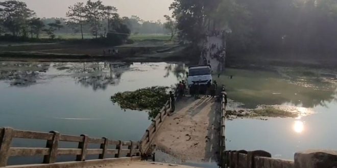 দেবরীনা মণ্ডল সাহা :- ডাম্পারের ভার সইতে না পারে ওই পণ্যবাহী যান-সমেত মরা রায়ডাক নদীতে ভেঙে পড়ল সেতু। শনিবার কোচবিহারের তুফানগঞ্জ-২ ব্লকের বারোকোদালি-২ গ্রাম পঞ্চায়েতের দেবগ্রামের ঘটনা। পুলিশ ও স্থানীয় সূত্রে জানা গিয়েছে, আজ, শনিবার ভোররাতে ওই সেতুর উপর দিয়ে একটি ডাম্পার যাচ্ছিল। মালবহনকারী ওই গাড়ির ভার নিতে পারেনি সেতুটি। মাঝামাঝি সেতুটি ভেঙে পড়ে। ডাম্বারটি নদীর জলে ভাঙা সেতুর উপর বিপজ্জনকভাবে আটকে থাকে। বিকট আওয়াজ শুনে নদীর পাড়ে ছুটে যান স্থানীয় বাসিন্দারা। ওই ঘটনা দেখে তাঁরাও আতঙ্কিত হয়ে পড়েন। খবর দেওয়া হয় স্থানীয় থানায়। পুলিশ-প্রশাসনের আধিকারিকরা দ্রুত ঘটনাস্থলে পৌঁছন। ওই ডাম্পারের চালক, খালাসিকে উদ্ধার করে হাসপাতালে নিয়ে যাওয়া হয়।সংশ্লিষ্ট সেতু দিয়ে অনেক কম সময়ে প্রতিবেশী রাজ্য অসমে পৌঁছোতে পারেন কোচবিহারবাসী। সেতু বিপর্যয়ের পর স্থানীয় বাজার তথা অসমের সঙ্গে যোগাযোয় বিচ্ছিন্ন। জয়নাল হক নামে এক স্থানীয় বাসিন্দা বলেন, ‘‘দীর্ঘ দিন ধরে সেতুটি দুর্বল ছিল। প্রশাসনের পক্ষ থেকে যদি একটি বোর্ড লাগিয়ে সতর্ক করা হত, তা হলে হয়তো এই দুর্ঘটনা হত না। আজ ভোরে পাথর বোঝাই একটি ডাম্পার সেতুটিতে ওঠার কারণে সেতুটি ভেঙে নদীতে পড়ে যায়।’’জয়নাল-সহ স্থানীয় বাসিন্দারা জানাচ্ছেন, ওই সেতু ভেঙে যাওয়ায় বিস্তীর্ণ এলাকার মানুষ সমস্যায় পড়লেন। তাঁদের কথায়, ‘‘অসম-বাংলা সীমান্তে থাকা মানুষজন এই সেতুটি দিয়ে দ্রুত যাতায়াত করতে পারতেন। এখন স্থানীয় আমবাড়ি বাজারের সঙ্গে বিস্তীর্ণ এলাকার মানুষের যোগাযোগ বিচ্ছিন্ন হয়ে পড়েছে। সরকারের কাছে আমাদের আবেদন, দ্রুত এই সেতুটি আবার নির্মাণ করা হোক।’’