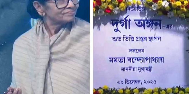 দেবরীনা মণ্ডল সাহা, কলকাতা :- একুশে জুলাইয়ের মঞ্চ থেকে মুখ্যমন্ত্রী মমতা বন্দ্যোপাধ্যায় ঘোষণা করেছিলেন, বাংলায় তৈরি হবে ‘দুর্গা অঙ্গন’। দিঘার জগন্নাথ মন্দিরের জনপ্রিয়তা এখন তুঙ্গে। এক কোটি মানুষ দেখতে গিয়েছেন দিঘার সেই মন্দির। এবার বাংলায় আরও শিলান্যাস হল দুর্গা অঙ্গনের। এই মন্দির তৈরি হচ্ছে কলকাতা শহরের একেবারে উপকন্ঠে। দিঘার মতোই এই মন্দির তৈরির দায়িত্ব দেওয়া হয়েছে হিডকোকেই। সেই দুর্গাঙ্গনের শিলান্যাস করে সোমবার মুখ্যমন্ত্রী মমতা বন্দ্যোপাধ্যায় বলেন, ”৩৬৫ দিনই মা দুর্গার পুজো হবে এখানে, নিত্য আঙিনা হবে। ৩৬৫ দিনই মা দুর্গাকে দেখতে পাবেন সকলে। সাংস্কৃতিক অনুষ্ঠান হবে। অনেক কর্মসংস্থান হবে। প্রচুর দোকান হবে। এটার নকশা তৈরি হয়েছে, জগন্নাথ ধামও তারা তৈরি করেছেন। আশা করি তারা কাজটা ভালো করবেন।”ছাব্বিশের ভোটের আগে মুখ্যমন্ত্রী ‘হিন্দুত্বে’ জোর দিচ্ছেন বলে বিরোধীরা যে রব তুলেছিলেন, তারও জবাব দিলেন তিনি। বললেন, ”আমি সব ধর্মকে শ্রদ্ধা করি। সব ধর্মের সব অনুষ্ঠানে থাকি। কারণ, আমি মনে করি ধর্ম যার যার, উৎসব সবার। জানেন এই দুর্গা অঙ্গন কেন তৈরি হচ্ছে? যাঁরা প্রশ্ন তুলছেন, তাঁদের বলি। ইউনেস্কো আমাদের সবচেয়ে বড় উৎসব দুর্গাপুজোকে কালচারাল হেরিটেজের তকমা দিয়েছে। তাদের স্বীকৃতিকে সম্মান জানাতে এই দুর্গা অঙ্গন তৈরি করা হল। সারাবছর এখানে মা দুর্গার নিত্যপুজো হবে।”এখানেই শেষ নয়, মুখ্যমন্ত্রী আরও বলেন, ”আজকের দিনটা একটা ঐতিহাসিক দিন। আজকে বলতে পারেন বাংলার মুকুটে একটা পালক যুক্ত হল। দুর্গাঙ্গন করার কারণ কী? আমরা যে সম্মান পেয়েছি ইউনেস্কোর থেকে, আগে যে জমিটা আমরা পেয়েছিলাম সেটা ১২ একর ছিল। আমি বললাম একটু ভাল জায়গা দেখো। বললাম পার্কিং, কালচারাল সেন্টার দরকার। এই জায়গা ১৭. ২৮ একর। অনেক বড় জায়গা। মানুষের আসার পক্ষে সুবিধা হবে।”একই সঙ্গে মুখ্যমন্ত্রী বলেন, ”মহাকাল মন্দির হয়ে গেলে সব হয়ে যাবে। গঙ্গাসাগর ব্রিজের জন্য আমরা অপেক্ষা করেছিলাম কেন্দ্রের অপেক্ষায়। কিন্তু এল না। আমরা গঙ্গাসাগর ব্রিজ তৈরি করছি। ১৭০০ কোটি টাকা দেওয়া হয়েছে। আমি ৫ তারিখ শিলান্যাস করতে যাচ্ছি। টেন্ডার হয়ে গেছে।”
