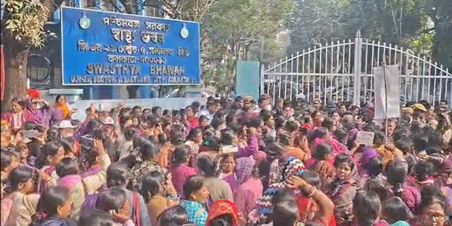 দেবরীনা মণ্ডল সাহা, কলকাতা :-১৬ দিন কর্মবিরতির পর এবার স্বাস্থ্যভবন অভিযান আশাকর্মীদের | যার জেরে বুধবার কার্যত ধুন্ধুমার পরিস্থিতি স্বাস্থ্যভবন চত্বরে। অভিযান শুরু হতেই মিছিল করে বিক্ষোভ দেখাতে শুরু করেন আশাকর্মীরা। যার জেরে সেক্টর ফাইভের ওই এলাকায় যান চলাচল বন্ধ করে দেয় পুলিশ। ব্যারিকেড ভেঙে ভিতরে ঢুকতে চাইলে বন্ধ করে দেওয়া হয় স্বাস্থ্যভবনের মূল গেটও। নুন্যতম ১৫ হাজার টাকা বাড়ানোসহ আট দফা দাবি আশাকর্মীদের | এই বিষয়ে সরকার হস্তক্ষেপ না করলে তাঁরা স্বাস্থ্যভবনের সামনেই অবস্থান বিক্ষোভে বসে যাওয়ার হুঁশিয়ারি দেন।অন্যদিকে নিরাপত্তার কথা ভেবে বন্ধ রাখা হয় স্বাস্থ্য দফতরের গেট। মোতায়েন করা হয়েছে বিশাল পুলিশবাহিনী। রাজ্যজুড়ে প্রায় তিন হাজার আশাকর্মী রয়েছেন। ন্যূন্যতম বেতন ১৫ হাজার টাকা করার দাবি জানিয়ে আসছেন তাঁরা। যদিও কয়েক দফায় তাঁদের ভাতা বাড়ানো হয়েছে। কিন্তু রয়ে গিয়েছে ক্ষোভ। আজ বুধবার ন্যূন্যতম বেতন ১৫ হাজার টাকা করা-সহ একাধিক দাবিতে স্বাস্থ্যভবন ঘেরাও এবং ডেপুটেশন কর্মসূচির ডাক দেন আশাকর্মীরা। সেই মতো সকাল থেকেই কড়া নিরাপত্তায় মুড়ে ফেলা হয় স্বাস্থ্যভবন-সহ গোটা এলাকা। তৈরি করা হয় একাধিক ব্যারিকেড।কিন্তু স্বাস্থ্যভবনের দিকে আশাকর্মীদের মিছিল কিছুটা এগোতেই তা আটকে দেওয়া হয়। এরপরেই দ্রুত পরিস্থিতি বদলে যায়। একেবারে উত্তপ্ত হয়ে ওঠে গোটা এলাকা। একের পর এক ব্যারিকেড ভেঙে আশাকর্মীরা স্বাস্থ্যভবনের দিকে এগোতে শুরু করেন। শুধু তাই নয়, পুলিশের সঙ্গেও ধ্বস্তাধস্তিতে জড়িয়ে পড়েন তাঁরা। পরিস্থিতি নিয়ন্ত্রণে রীতিমতো হিমশিম খান পুলিশ আধিকারিকরা।প্রসঙ্গত, এর আগেও একাধিকবার টাকা বাড়ানোর দাবিতে সরব হয়েছেন আশাকর্মীরা। কিন্তু সরকারের তরফ থেকিএ বিশেষ কোনও সিদ্ধান্ত নেওয়া হয়নি। যার জেরে আরও বৃহত্তর আন্দোলনের ডাক দিয়েছে আশা কর্মীরা। এখন স্বাস্থ্যভবনের তরফে কী পদক্ষেপ নেওয়া হয় সেটাই দেখার।