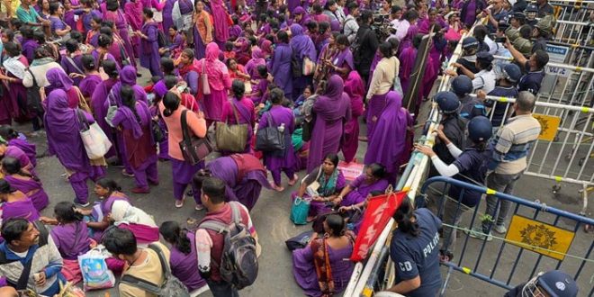 প্রসেনজিৎ ধর, কলকাতা :- মাসিক ভাতা বৃদ্ধি সহ আটদফা দাবি নিয়ে স্বাস্থ্যভবন অভিযানে নেমেছেন আশাকর্মীরা। শহরের বিভিন্ন প্রান্ত মিছিল শুরু হয়েছে। পুলিশও নিরাপত্তার স্বার্থে বাধা দিচ্ছে। শিয়ালদহ, ধর্মতলার কাছে আশাকর্মীদের মিছিলে উত্তেজনার পরিবেশ তৈরি হয়। মিছিলে যোগ দিতে আসেন বিজেপি নেত্রী লকেট চট্টোপাধ্যায়। তাঁকে ‘গো ব্যাক’ স্লোগান দেওয়া হয়। মিছিলে রাজনৈতিক রং লাগত দেওয়া হবে না বলে জানিয়ে দেন বিক্ষোভকারীরা। শিয়ালদহ ছাড়াও একাধিক জেলা থেকে স্বাস্থ্যভবনমুখী মিছিলের প্রতিটিতেই পুলিশের বাধা ছিল। তা উপেক্ষা করে এগিয়ে চলেছিলেন বিক্ষোভকারীরা। কোথাও কোথাও প্রতিবাদে রাস্তা অবরোধও চলে। তবে পরিস্থিতি বেশি উত্তপ্ত হতে শুরু করে কলকাতায় মিছিল প্রবেশের পর। বিশেষত শিয়ালদহ থেকে ধর্মতলার দিকে যাওয়া মিছিলকে এসএন ব্যানার্জি রোডে পুলিশ ব্যারিকেড দিয়ে আটকাতে চাইলে ধুন্ধুমার পরিস্থিতি তৈরি হয়।সল্টলেকের দিকে আসা একটি মিছিলকে পুলিশ আটকাতে গেলে সেখানে পৌঁছে যান বিজেপি মহিলা মোর্চার ইনচার্জ লকেট চট্টোপাধ্যায়। তাঁকে দেখেই বিক্ষোভকারীরা ‘গো ব্যাক’ স্লোগান দিতে থাকেন। তাঁদের সাফ বক্তব্য, নিজেদের মিছিলে কোনও রাজনীতির রং লাগতে দেবেন না।এদিকে, আশাকর্মীদের মিছিল ঘিরে স্বাস্থ্যভবনের আঁটসাঁটো করা হয়েছে। মিছিল যত এগোয় তত নিরাপত্তাও বাড়ানো হয়েছে পুলিশের তরফে। স্বাস্থ্যভবনের সামনে মাইকিং করেন পুলিশকর্তারা। আর সেখানে পুলিশের বাধা পেয়ে রাস্তায় বসে নিজেদের দাবিদাওয়া নিয়ে সোচ্চার হন আশাকর্মীরা।