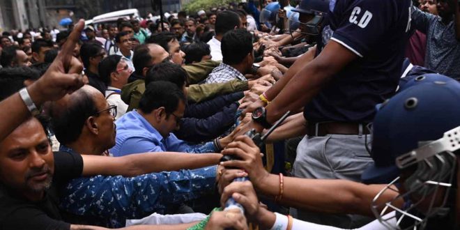 প্রসেনজিৎ ধর, কলকাতা :- ফর্ম ৬ জমা করার অভিযোগকে কেন্দ্র করে স্ট্র্যান্ড রোডে সিইও দফতরের সামনে তুলকালাম কাণ্ড| দফায় দফায় সংঘর্ষে জড়ালেন বিজেপি এবং তৃণমূল কর্মী সমর্থকরা| বিজেপি-র পক্ষ থেকে সিইও দফতরে ঢুকে ফর্ম সিক্স জমা দিচ্ছে, এই অভিযোগকে কেন্দ্র করে উত্তেজনার সূত্রপাত| কোনওমতে দু পক্ষকে সামাল দেয় পুলিশ এবং কেন্দ্রীয় বাহিনী |রাজ্যের মুখ্য নির্বাচনী আধিকারিকের (সিইও) অফিসে ফর্ম ৬ জমা দিতে এসেছিলেন এক যুবক। তাঁকে ‘হাতেনাতে ধরে ফেলা হয়’। এমনই অভিযোগ তুলে সিইও অফিসের সামনে বিক্ষোভ দেখান তৃণমূলপন্থী বিএলও-রা। রাস্তায় বসে স্লোগান দিতে শুরু করেন তাঁরা। কিছু ক্ষণ পরেই ঘটনাস্থলে পৌঁছোন বিজেপি কর্মীরাও। মারধরের অভিযোগ তুলে তাঁরাও সিইও অফিসের সামনে পাল্টা বিক্ষোভ দেখান। স্লোগান, পাল্টা স্লোগানে উত্তপ্ত হয়ে ওঠে সিইও অফিসের সামনের রাস্তা। সামাল দিতে হিমশিম খেতে হচ্ছে পুলিশকে। ঘটনাস্থলে রয়েছে কেন্দ্রীয় বাহিনীও।সিইও অফিসে ফর্ম ৬ জমা করার অভিযোগকে ঘিরে যখন তৃণমূলপন্থী বিএলও-রা বিক্ষোভ শুরু করেন, তখন হঠাৎই সেখানে উপস্থিত হন বিজেপি কর্মীরা। নেতৃত্বে দেখা যায় চৌরঙ্গীর বিজেপি প্রার্থী সন্তোষ পাঠককে। তাঁদের অভিযোগ, এক বিজেপি কর্মীকে মারধর করা হয়েছে। তবে কাকে মারধরের অভিযোগ করছে বিজেপি, তা স্পষ্ট নয়। তবে সিইও অফিসের সামনে তাঁরা বিক্ষোভ দেখানো শুরু করেন। তৃণমূলের বিরুদ্ধে পাল্টা স্লোগান দেয় বিজেপিও। আর তার ঠিক কিছুটা দূরে অবস্থানে বসে পড়েন তৃণমূলপন্থী বিএলও-রা।দু’পক্ষের বিক্ষোভে উত্তেজনা ছড়ায় সিইও অফিসের সামনে। দু’পক্ষের মাঝে রয়েছে পুলিশ। গার্ডরেল দিয়ে দু’পক্ষকে আটকানোর চেষ্টা করে তারা। তবে পুলিশের গার্ডরেল ভেঙে, টপকে এগিয়ে যাওয়ার চেষ্টা করেন কয়েক জন। তখনই পরিস্থিতি আরও উত্তপ্ত হয়ে ওঠে। দু’পক্ষই সিইও অফিসের সামনে বসে বিক্ষোভ দেখাচ্ছে। পরে বিজেপির তরফে অভিযোগ করা হয়, তারা যেখানে বিক্ষোভ দেখাচ্ছিল, সে দিক থেকে একদল তৃণমূল কর্মী হাতে দলীয় পতাকা নিয়ে চড়াও হন। সিইও অফিসের সামনে থাকা বিজেপি কর্মীদের মারধর করা হয় বলে অভিযোগ। ঘটনাস্থলে কয়েকটি বাইক রাস্তার উপরে পড়ে থাকতেও দেখা যায়। অভিযোগ, দু’পক্ষের ধস্তাধস্তির সময় বাইকগুলি ফেলে দেওয়া হয় রাস্তার উপর। পুলিশ বিক্ষোভ হটাতে লাঠিচার্জ করেছে বলে অভিযোগ।