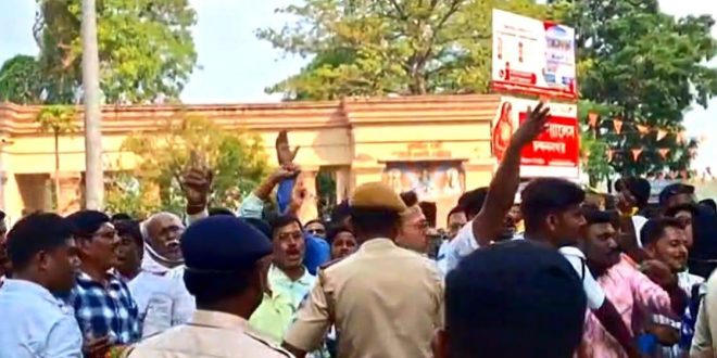 প্রসেনজিৎ ধর, হুগলি:- চন্দননগর মহকুমা শাসকের দপ্তরের সামনে মনোনয়নপত্র জমা দেওয়াকে কেন্দ্র করে তৃণমূল ও বিজেপি সংঘাত। মঙ্গলবার দুই পক্ষের মিছিল মুখোমুখি হতেই পরিস্থিতি উত্তপ্ত হয়ে ওঠে। রাস্তার মাঝেই বসে পড়ে বিক্ষোভ দেখাতে শুরু করেন তৃণমূল কর্মী-সমর্থকরা। পরিস্থিতি সামাল দিতে ঘটনাস্থলে বিশাল পুলিশ বাহিনী ও কেন্দ্রীয় বাহিনী মোতায়েন করা হয়েছে। দফায় দফায় স্লোগান ও পাল্টা স্লোগানে এলাকায় উত্তেজনা ছড়়ায়।এদিন চন্দননগর মহকুমা শাসকের দফতরে মনোনয়ন জমা দিতে এসেছিলেন তারকেশ্বরের তৃণমূল প্রার্থী রামেন্দু সিংহ রায়। একই সময়ে মনোনয়ন জমা দিতে এসেছিলেন তারকেশ্বরের বিজেপি প্রার্থী সন্তু পান। সূত্রের খবর, সন্তু পান যখন মনোনয়ন জমা দিয়ে বেরিয়ে যাচ্ছিলেন সেই তৃণমূলের কর্মী সমর্থকেরা জয় বাংলা স্লোগান দিতে শুরু করেন। তবে থেমে থাকেনি পদ্ম কর্মীরাও। মুহূর্তেই তাঁরা জয় শ্রী রাম স্লোগান দিতে শুরু করেন। পরিস্থিতি রীতিমতো তপ্ত হয়ে ওঠে। মুখোমুখি হতেই শুরু হয়ে যায় বচসা। কিছু সময়ের মধ্যেই কেন্দ্রীয় বাহিনী এসে দুই দলের কর্মী-সমর্থককেই ওই জায়গা থেকে সরিয়ে দেয়। ছুটে আসে পুলিশও। প্রসঙ্গত, এর আগেই তারকেশ্বর থেকে একাধিকবার সংঘর্ষের ছবি সামনে এসেছে। বিজেপি প্রার্থীর গাড়ি ভাঙচুরের অভিযোগ ওঠে শাসকদল তৃণমূল কংগ্রেসের বিরুদ্ধে। এই ঘটনাকে কেন্দ্র করে তারকেশ্বর থানার সামনে ব্যাপক বিক্ষোভ দেখান বিজেপি নেতা-কর্মীরা।নির্বাচন কমিশনের নিয়ম অনুযায়ী মনোনয়ন কেন্দ্রের নির্দিষ্ট দূরত্বের মধ্যে জমায়েত করা নিষিদ্ধ। তা সত্ত্বেও কী ভাবে মহকুমা শাসক দপ্তরের একেবারে সামনে দু’দলের এত সমর্থক জড়ো হলেন, তা নিয়ে উঠছে প্রশ্ন। তবে আগে থেকেই কেন্দ্রীয় বাহিনী ও পুলিশ মোতায়েন থাকায় বড় সংঘর্ষ এড়ানো সম্ভব হয়েছে। পরে, পুলিশ অতিরিক্ত বাহিনী নিয়ে এসে দু’পক্ষের সমর্থকদের জমায়েত ছত্রভঙ্গ করে দেয়।