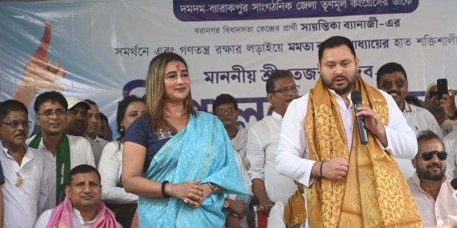 প্রসেনজিৎ ধর :-বাংলার বিধানসভা নির্বাচনের প্রচারে এবার ঘাসফুল শিবিরের হয়ে ময়দানে নামলেন আরজেডি নেতা তেজস্বী যাদব। শনিবার উত্তর ২৪ পরগনার বরাহনগরে তৃণমূল প্রার্থী সায়ন্তিকা বন্দ্যোপাধ্যায়ের সমর্থনে এক বিশাল জনসভা করেন তিনি। আলামবাজার মোড়ের সেই সভা থেকে তেজস্বী দাবি করেন, বাংলায় মমতা বন্দ্যোপাধ্যায়ই ফের মুখ্যমন্ত্রী হচ্ছেন এবং তাঁদের আসল লক্ষ্য ২০২৯ সালে দিল্লি থেকে বিজেপিকে উৎখাত করা।এদিন বরাহনগরের আলামবাজার মোড়ে সায়ন্তিকার হয়ে সভা করেন তেজস্বী। সেখানে ছিলেন তৃণমূল সাংসদ সৌগত রায়ও। আর সেই সভা থেকেই তেজস্বী বলেন, “বাংলায় তো মমতাজি জিতবেনই। আর বাংলায় জেতার পর আমরা সবাই মিলে ২০২৯ সালে দিল্লি থেকে বিজেপিকে উৎখাত করার কাজ করব।” বাংলায় যে সব বিহারী ভোটার রয়েছেন, তাঁদের বার্তা দিয়ে আরজেডি এই নেতা বলেন, “বাঙালি ও বিহারীরা এক হলে কারও সাধ্য নেই হেলানোর। সব বিহারী এক থাকুন। এখানে এসে মনে হচ্ছে বিহারে প্রচার করছি।”একদিকে কংগ্রেস নেতা রাহুল গান্ধী যখন বাংলায় এসে তৃণমূলকে নিশানা করছেন, তখন ইন্ডিয়া জোটের শরিক তেজস্বী কেন মমতার হয়ে সওয়াল করছেন— তা খোলসা করেন তেজস্বী নিজেই। তিনি বলেন, “মমতাজির পিছনে ইডি, সিবিআই, আয়কর সব কেন্দ্রীয় শক্তি লাগিয়ে দেওয়া হয়েছে। আমাদের পিছনেও তাই করা হয়েছে। কিন্তু লালুজি লড়ছেন, মমতাজিও লড়ছেন। এসব দেখেই আমাদের মতো তরুণ নেতারা অনুপ্রাণিত হই।”তেজস্বীর এদিনের বার্তা নিয়ে তৃণমূল সাংসদ সৌগত রায় বলেন, “তেজস্বী বিহারের সবচেয়ে জনপ্রিয় নেতা। বলে গেলেন, সব বিরোধী দল এক হয়ে আমরা মোদীকে হটাব ২০২৯ সালে। আজ সেটা আরও শক্তিশালী হল।” অন্যদিকে, তৃণমূল প্রার্থী সায়ন্তিকা বলেন, “তেজস্বী যাদব আসায় আমরা খুব খুশি হয়েছি। তিনি এখানে এসে নিজের মনের কথা বলেছেন। তিনি বলেছেন, বিহারের নির্বাচনের সময় ছাতু খেয়েছেন। আর এখানে এসে ঝালমুড়ি খেয়েছেন। মানুষ এই নাটক বুঝতে পারছেন।”